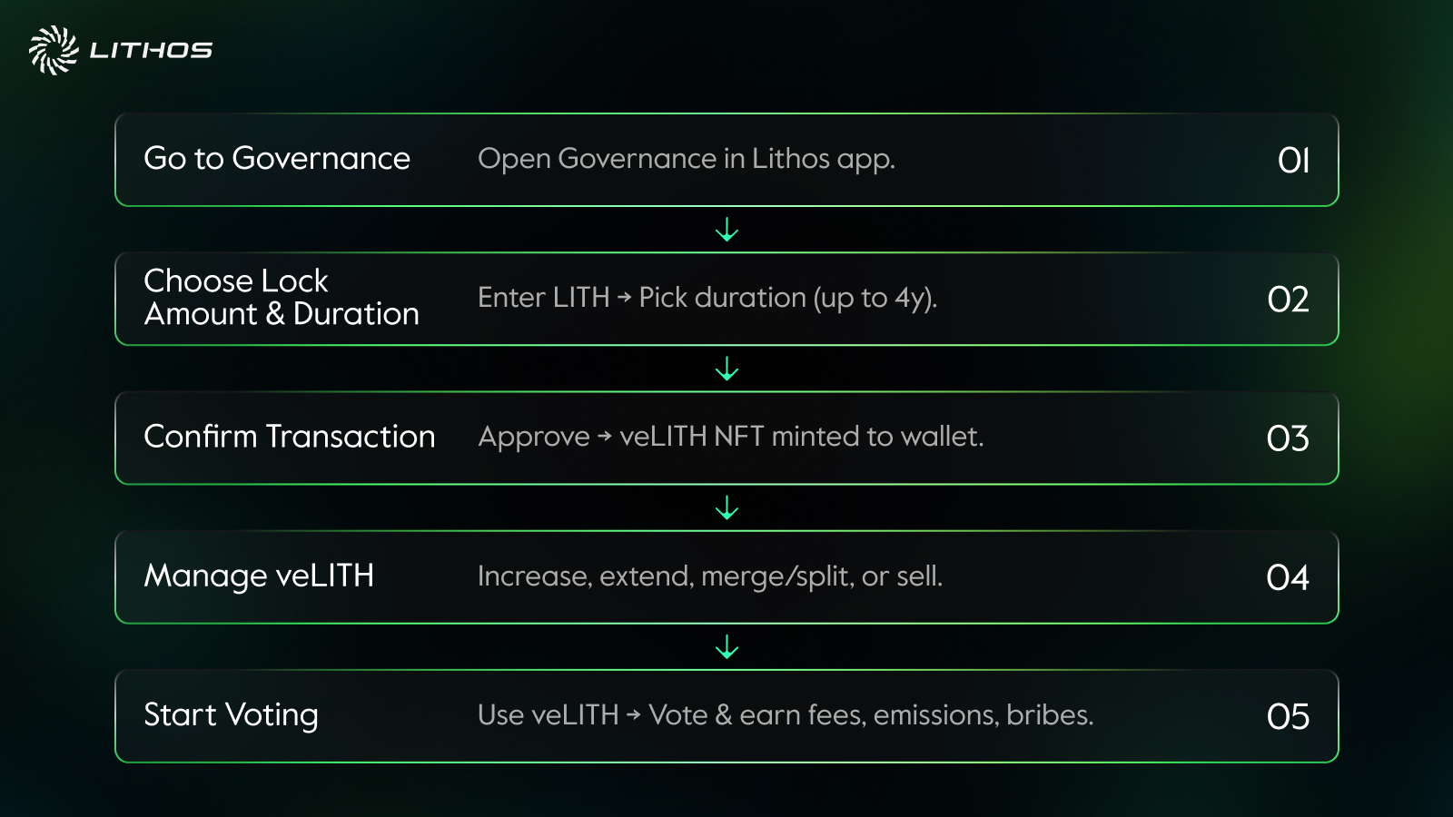 Locking LITH creates veLITH, which grants voting power and access to governance rewards.