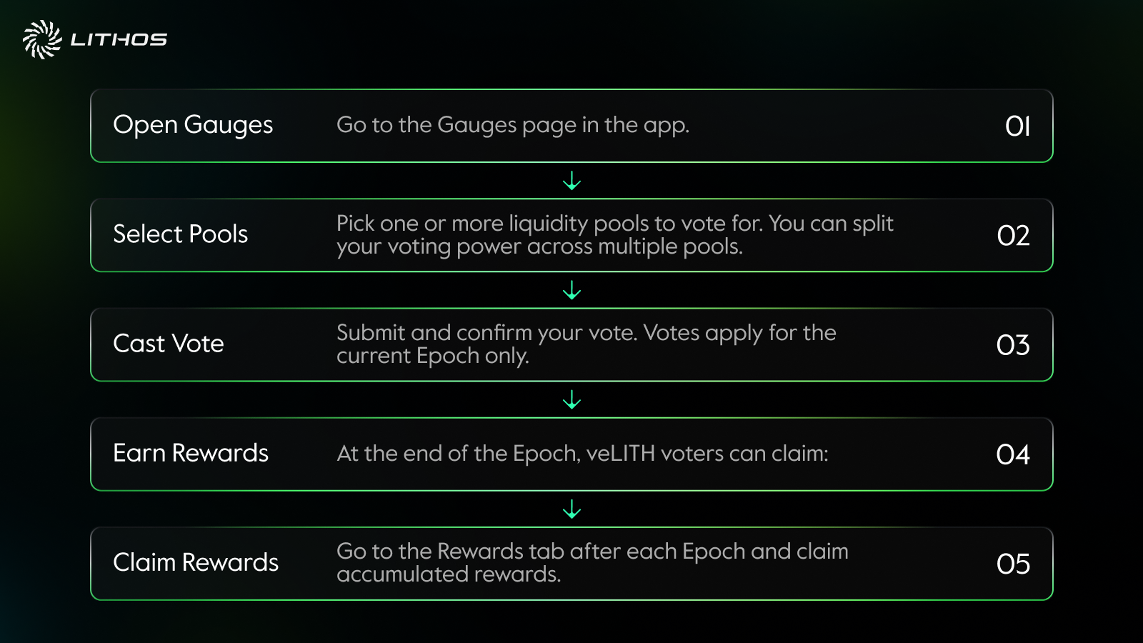 Voting with veLITH determines how LITH emissions are allocated. Voters also earn a mix of fees, incentives, and anti-dilution rebases.