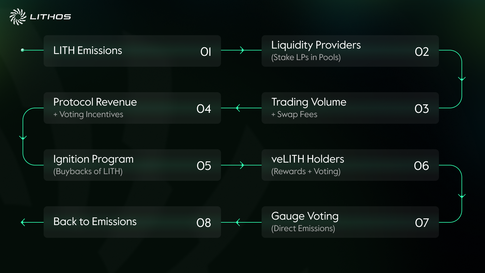 - Governance Loop: veLITH votes direct emissions → pools attract liquidity and bribes → veLITH voters earn more rewards → locking demand increases.